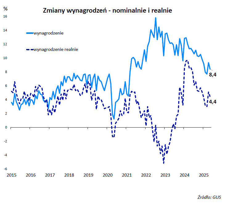 Choć w kolejnych miesiącach 2025 dynamika wzrostu pensji nieco wyhamowała (do około 7-9 proc. w ujęciu rocznym), to przy spadającej inflacji siły nabywcza konsumentów i tak rosła.
