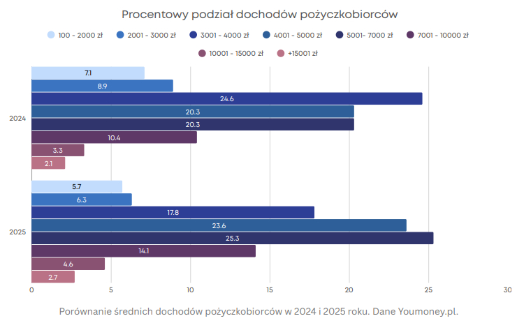 W 2025 klienci portalu z dochodem powyżej 5000 zł stanowili 48,4 proc. wszystkich, podczas gdy rok wcześniej było to tylko 38,8 proc. To istotna zmiana pokazująca, że pożyczki pozabankowe przestają być produktem wykorzystywanym wyłącznie w sytuacjach finansowej desperacji.